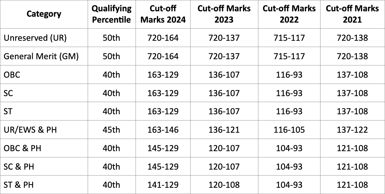 The NEET-UG Cutoff score is officially declared by the National Testing Agency annually. Here are the category-wise NEET Cutoff scores from recent years for your reference: